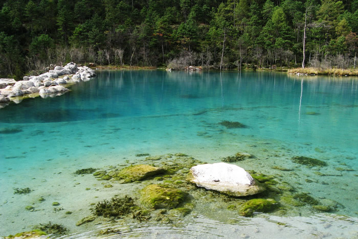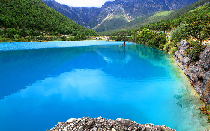 蓝月谷中的河水在流淌过程中因受山体阻挡,形成了四个较大的水面,人称“玉液”湖、“镜潭”湖、“蓝月”湖和“听涛”湖。