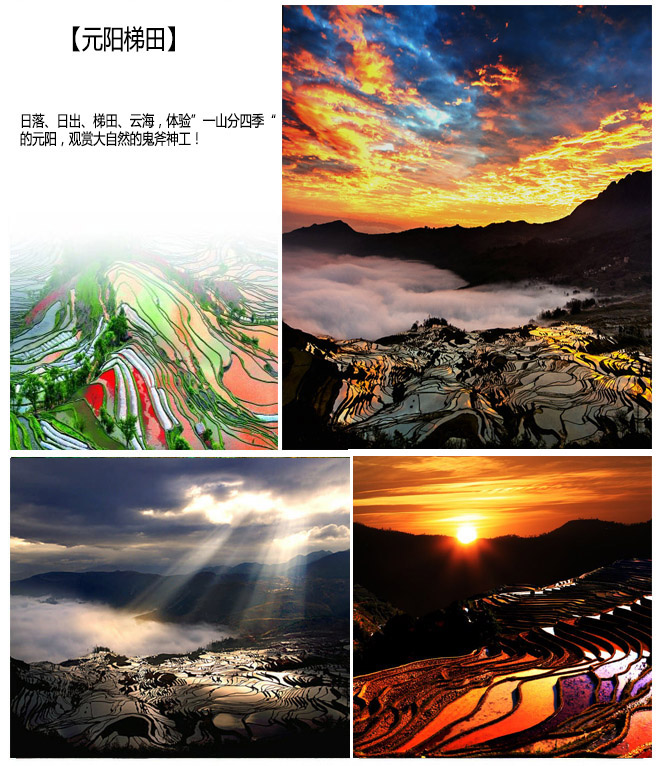 早餐后,游览元阳申报申报世界遗产的元阳梯田核心区之二——多依树梯田(27公里、行车1小时,观日出及云海最佳,需早起)世界遗产核心景区,多依树景区包括多依树、爱春、大瓦遮等连片9000多亩梯田,其形状如一个大海湾,星罗棋布的哈尼族、彝族村寨点缀期间,壮美和谐。是游客观看日出最好的地点。返回昆明游览花之城;游览昆明有花之世界只说到昆明不到花之城如到北京不登长城只说